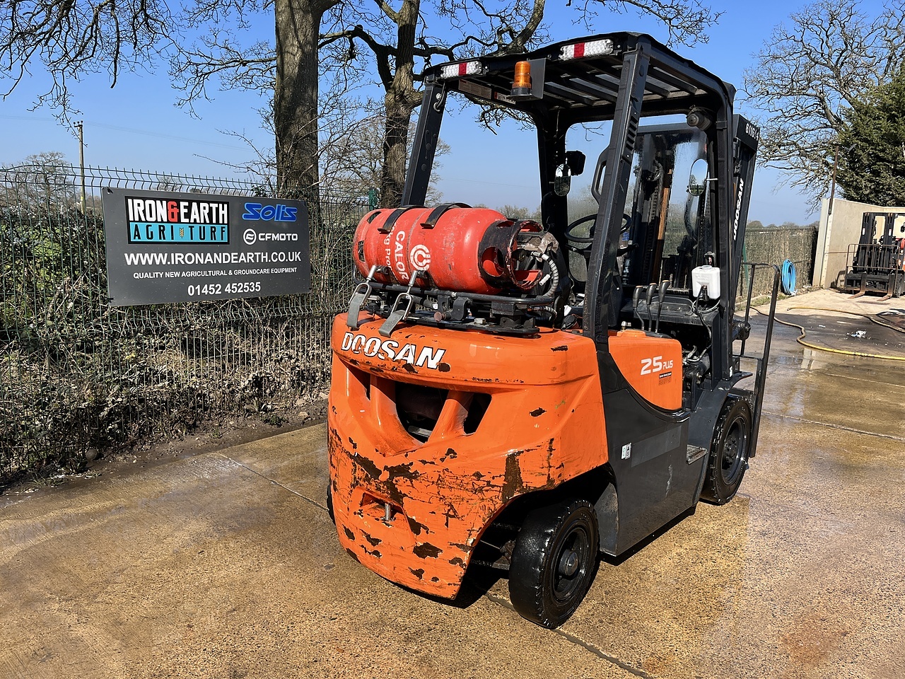Doosan G25GP With 2578 Hours. Lifts 2.5 Tonne, Max Lift Height Of 4.7m, Mitsubishi Engine, LPG, Triple Free Lift Mast, Container Spec, Side Shift, Working Lights, Amber Site Beacon. Supplied With Pallet Forks.